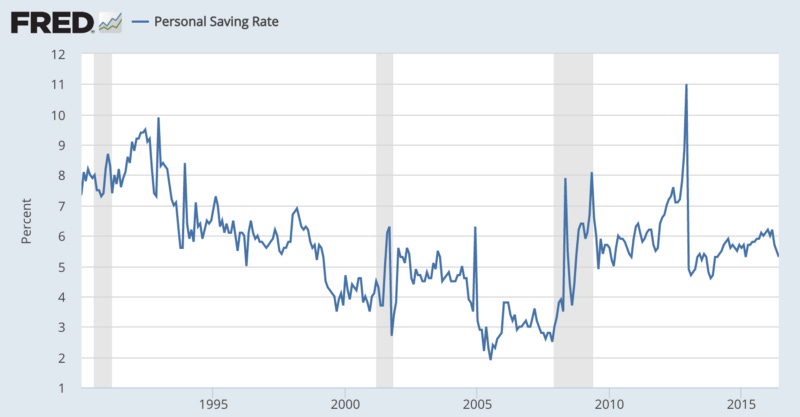 The rate of savings is relatively low in 2016. After reaching all-time lows in 2005 at about 1.9% and rebounding upwards post-08, we have seen that consumers are only saving 5% as a percentage of personal disposable income. That’s a relatively small deposit compared to just a few years ago, when consumer confidence was lower. This makes sense. Given that interest rates are minimal, investments in the markets may seem a bit more enticing.