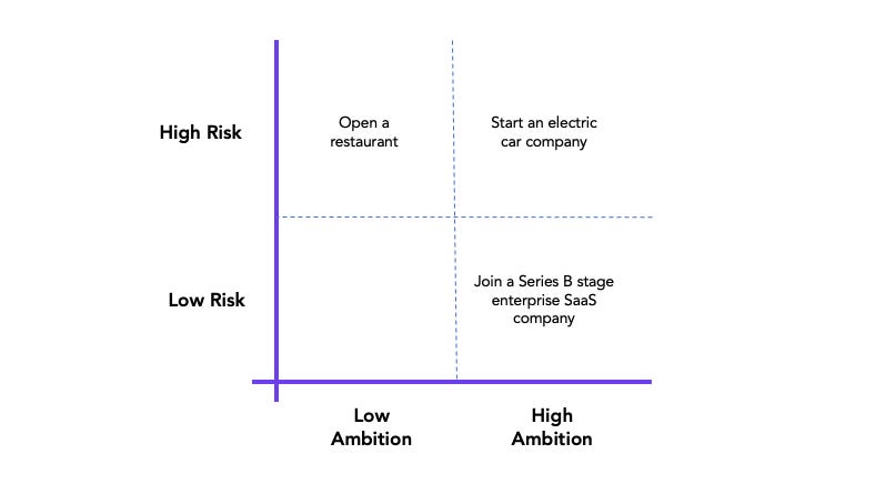 You should ask yourself how risk-tolerant and ambitious you’d like to be in this next game you play. Each combination of the two factors comes with a set of responsibilities, externalities, and lifestyles. Many people oscillate between low and high-risk profiles over their career arch, depending on circumstances. That’s totally okay. It’s good to know where you’re at and the risk level you can currently afford.